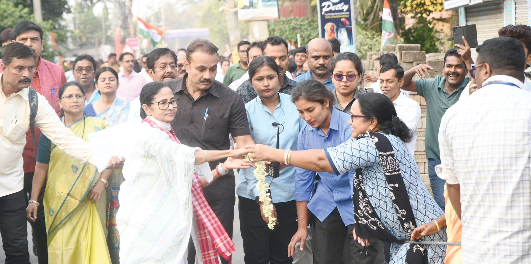 ठाकुरनगर । पश्चिम बंगाल की मुख्यमंत्री ममता बनर्जी ने मंगलवार को राज्य में मतदाता सूची को लेकर चल रहे विशेष गहन पुनरीक्षण (एसआईआर) के विरोध में नॉर्थ 24 परगना जिले के बनगांव के चांदपारा से मतुआ के गढ़ ठाकुरनगर तक तीन किमी का मार्च निकाला।