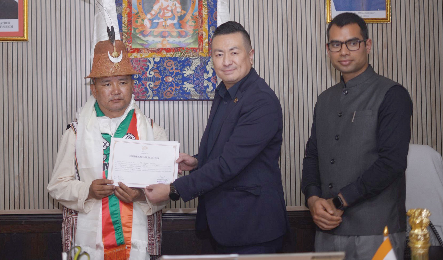 इसके उपरांत आज मंगन के एडीएम पेमा वांगछेन नामकारपा द्वारा एसडीएम संदीप कुमार की उपस्थिति में सभी निर्वाचित उम्मीदवारों को औपचारिक घोषणा पत्र एवं निर्वाचन प्रमाण पत्र प्रदान किया गया। मंगन नगर पंचायत के विभिन्न वार्डों से निर्विरोध निर्वाचित उम्मीदवारों में छिरिंग पिंछो सारिंग, फुरकित लेप्चा, नरबू रिनछेन लेप्चा, हंगु लाचेनपा, छिरिंग डोमा भूटिया शामिल हैं। उल्लेखनीय है कि सभी पांचों निर्वाचित उम्मीदवार सिक्किम एसकेएम पार्टी से संबंधित हैं।