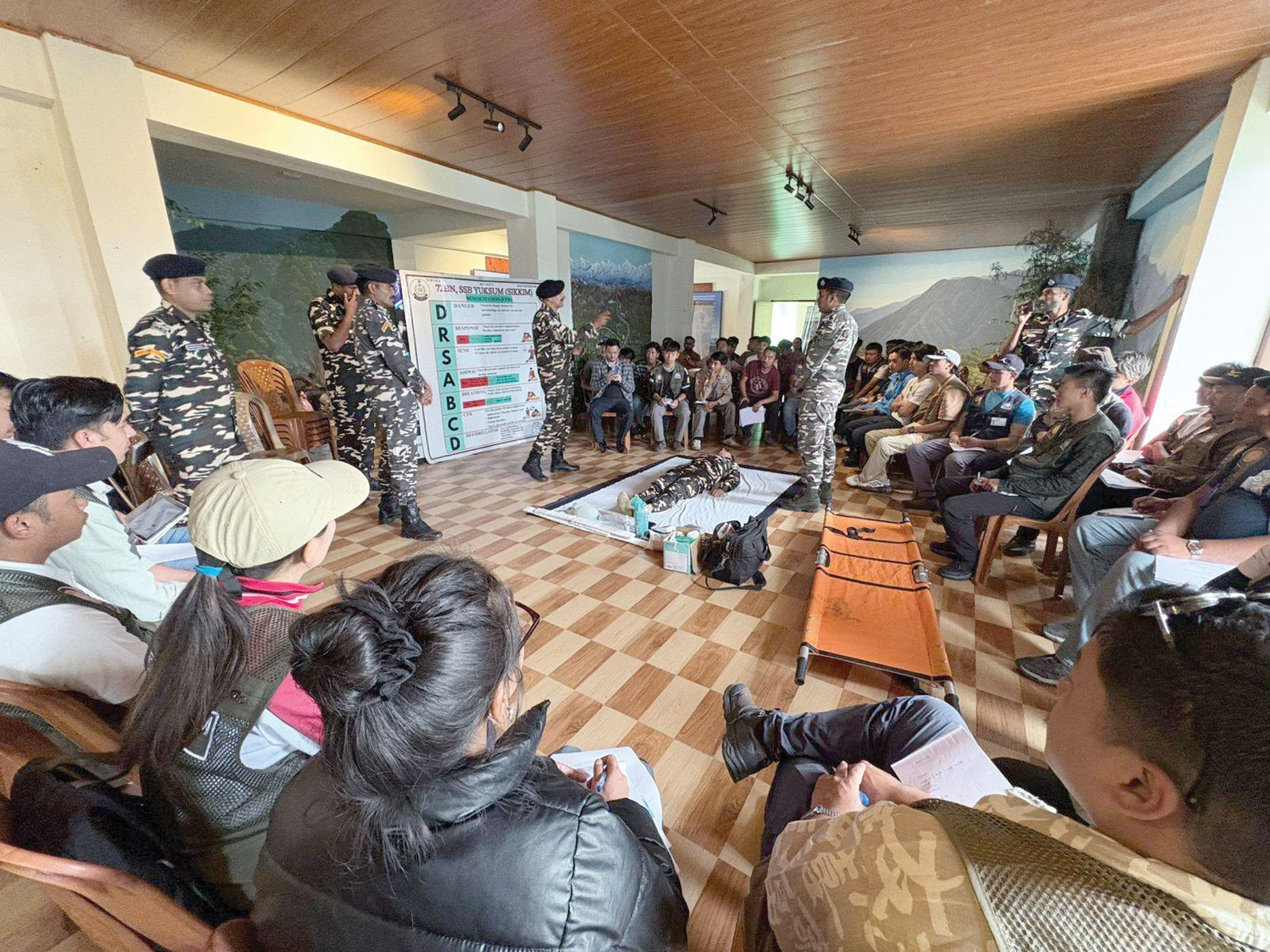 दूसरे सत्र में बलम राम ठाकुर ने पहचान एवं फील्ड मैनेजमेंट प्रोटोकॉल, आपातकालीन प्रतिक्रिया तथा निकासी प्रक्रियाओं पर प्रशिक्षण दिया। इस दौरान लक्षणों की पहचान, त्वरित प्रतिक्रिया तंत्र, मानक संचालन प्रक्रिया के आधार पर केस स्टडी, बचाव समन्वय एवं संचार प्रणाली पर विशेष जोर दिया गया। तीसरे सत्र में 72वीं बटालियन एसएसबी, योक्सम के एएसआई/पीएच गुरमंत सिंह और सीआई/एनओ ओम प्रकाश द्वारा प्रायोगिक प्रदर्शन एवं सिमुलेशन अभ्यास कराए गए। इसमें ऑक्सीजन सपोर्ट सिस्टम का उपयोग, प्राथमिक उपचार, सीपीआर तकनीक, निकासी विधियां, गैमो बैग का प्रयोग तथा आपातकालीन स्थिति से निपटने के लिए मॉक ड्रिल शामिल थे।